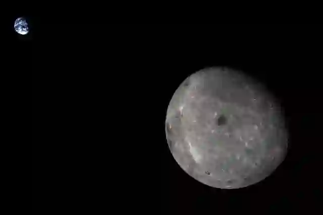嫦娥五号T1服务舱曾经前往月球背面的地月L2点,为鹊桥号中继星积累了宝贵的经验。这张地球(左上)和月球的合影,就是嫦娥五号T1在月球背面拍摄的。