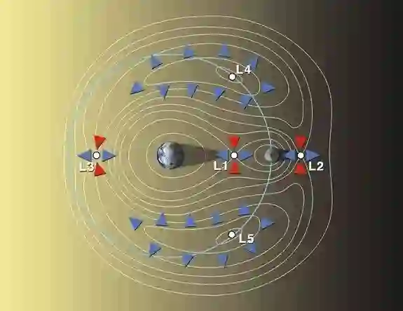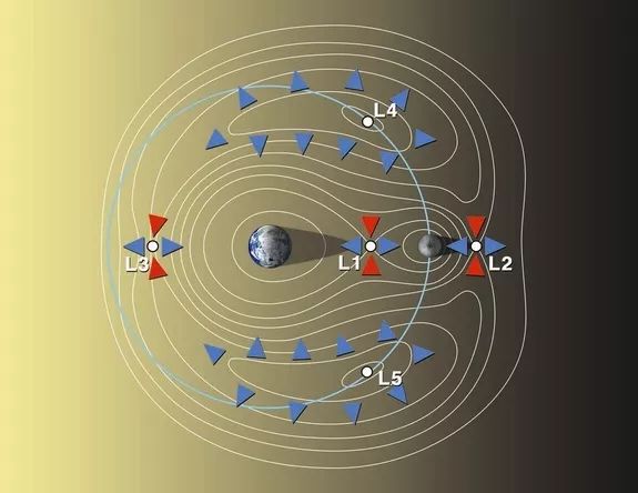 地月系统的拉格朗日点是地月引力的平衡点。图片来源:LPI-JSC Center for Lunar Science and Exploration