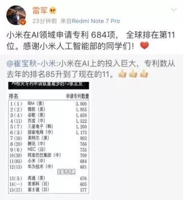 雷军:小米在AI领域申请专利684项,全球排第11位