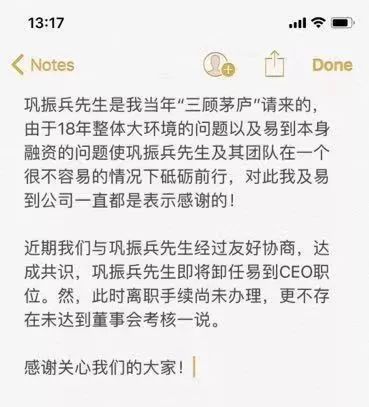 36氪讯,针对易到CEO巩振兵将离职的传闻,韬蕴资本CEO温晓东在朋友圈发文回应称,“近期我们与巩振兵先生经过友好协商,达成共识,巩振兵先生即将卸任易到CEO职位。然,此时离职手续尚未办理,更不存在未达到董事会考核一说。”