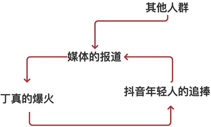 进而推动了越来越多对于丁真的采访和曝光,让更多的人参与到这个现象级的事件中去,进入到了一个增强回路的循环系统,而丁真巧好是这系统中的一个重要的发起点。