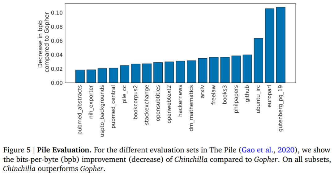 语言建模任务。如下图 5 所示,Chinchilla 在 The Pile 的所有评估子集上均显著优于 Gopher。