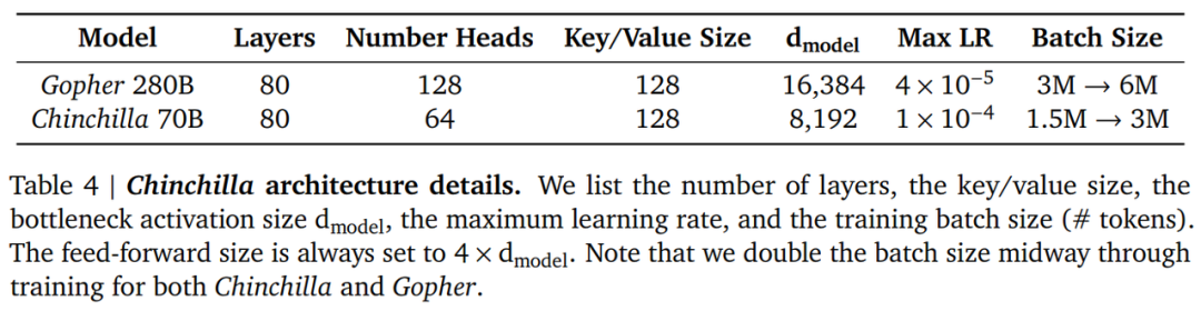 Chinchilla 的训练超参数及其与 Gopher 的比较如下表 4 所示。两者使用了相同的模型架构和训练设置,但在 head 数量、批大小等方面有所不同。