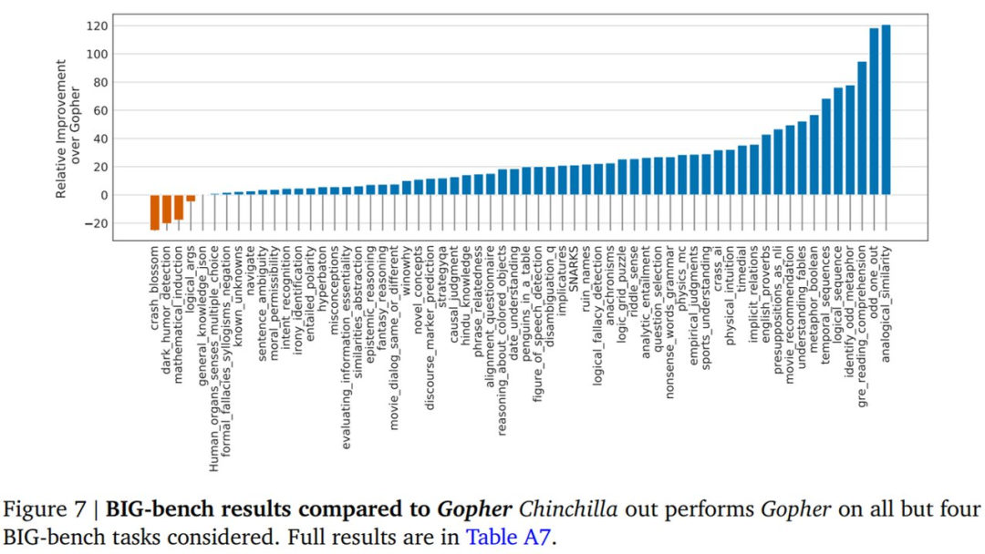 BIG-bench。DeepMind 在 BIG-bench 任务上评估了 Chinchilla,与 MMLU 中观察到的情况类似,Chinchilla 在多项任务上优于 Gopher。