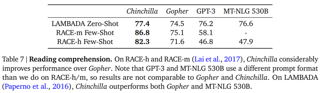 阅读理解。在单词预测数据集 LAMBADA 上,Chinchilla 达到了 77.4% 的准确率,而 Gopher 和 MT-NLG 530B 的准确率分别为 74.5% 和 76.6%(见表 7)。在 RACE-h 和 RACE-m 上,Chinchilla 的性能大大优于 Gopher,两种情况下的准确率都提高了 10% 以上。