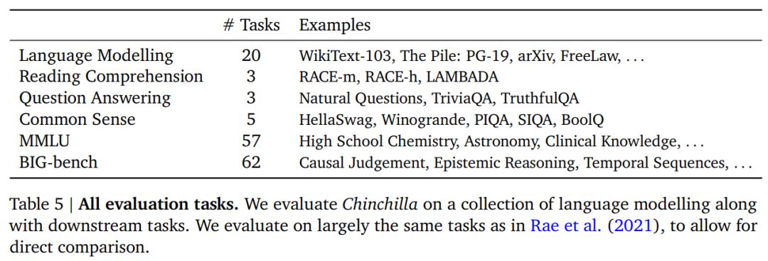 研究者对 Chinchilla 进行了广泛的评估,与各种大规模语言模型在 Rae et al. (2021)提出的很多任务上展开了比较。这些任务包括语言建模(LM)、阅读理解、问答、常识、MMLU 和 BIG-bench,具体如下表 5 所示。