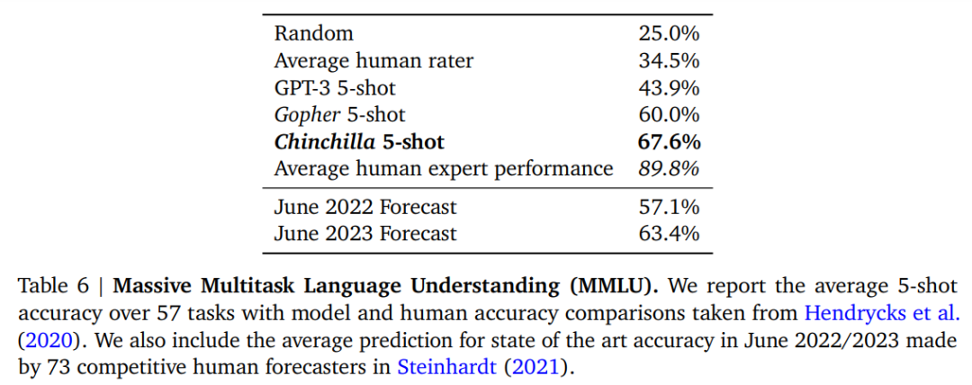 多任务语言理解(MMLU)任务。大规模 MMLU 基准测试包含一系列与学科类似的考试问题。在下表 6 中,研究者展示了 Chinchilla 在 MMLU 上的平均 5-shot 性能。可以看到,尽管规模小得多,但 Chinchilla 明显优于 Gopher,平均准确率为 67.6%,比 Gopher 提高了 7.6%。并且,Chinchilla 的准确率甚至超过了 2023 年 6 月专家预测的 63.4% 。