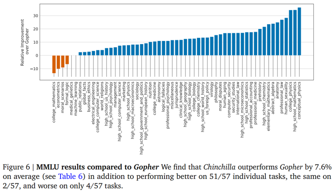 在图 6 中,DeepMind 展示了按任务细分结果与 Gopher 的比较。总的来说,研究发现 Chinchilla 提高了绝大多数任务的性能。在四个任务(college_mathematics、econometrics、moral_scenarios 和 formal_logic)上,Chinchilla 的表现不如 Gopher,并且在两个任务上的表现没有变化。