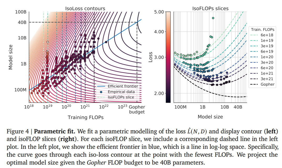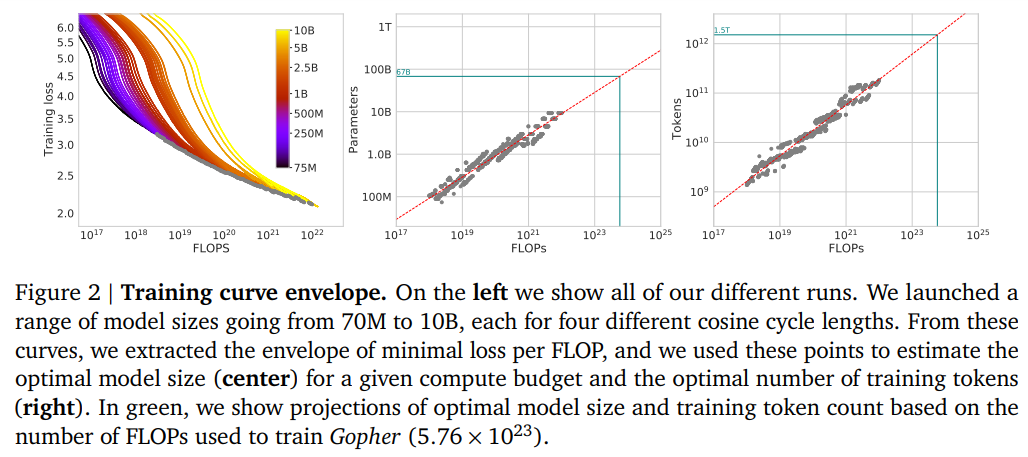 基于 DeepMind 估计的计算最优边界,他们预测用于训练 Gopher 的计算预算,一个最优模型应该是模型大小比之前小 4 倍,而训练的 token 应该是之前的 4 倍多。