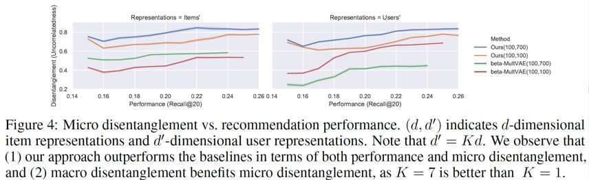 我们在某个小规模数据集上定量测量了解离化程度(及其与推荐性能之间的关系)。初步发现:(1)解离化程度较高与推荐性能好这两者之间有较强的相关性;(2)引入宏观解离化后,确实大大改善了微观解离化;(3)我们的方法无论是解离化程度还是推荐性能,都优于基线方法。