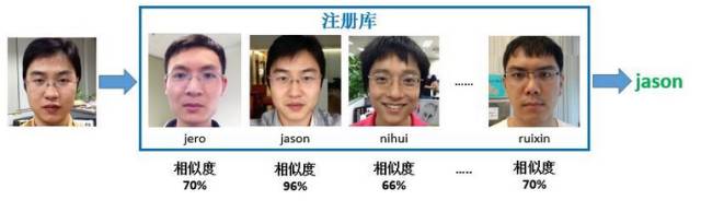 举例说明:人脸识别过程如下,判断结果为输入图像为注册库中的jason