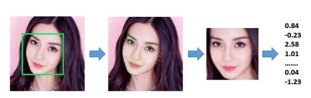 人脸提特征过程的输入是 “一张人脸图”和“人脸五官关键点坐标”,输出是人脸相应的一个数值串(特征)。人脸提特征算法实现的过程为:首先将五官关键点坐标进行旋转、缩放等等操作来实现人脸对齐,然后在提取特征并计算出数值串。