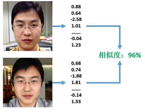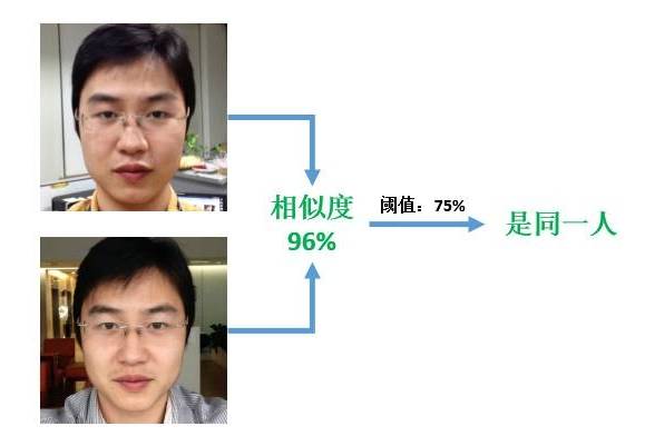 举例说明:人脸验证过程如下,相似度96%大于阈值75%,判定属于同一个人