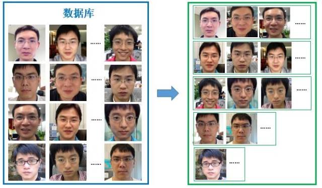 举例说明:人脸聚类过程如下,右侧绿框内按身份的分组结果为聚类结果