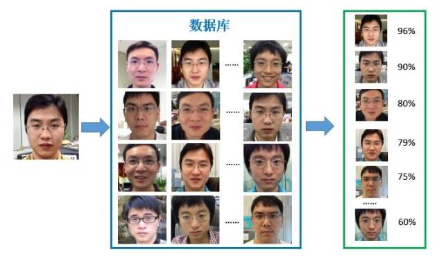 人脸检索通过将输入的人脸和一个集合中的说有人脸进行比对,根据比对后的相似度对集合中的人脸进行排序。根据相似度从高到低排序的人脸序列即使人脸检索的结果。