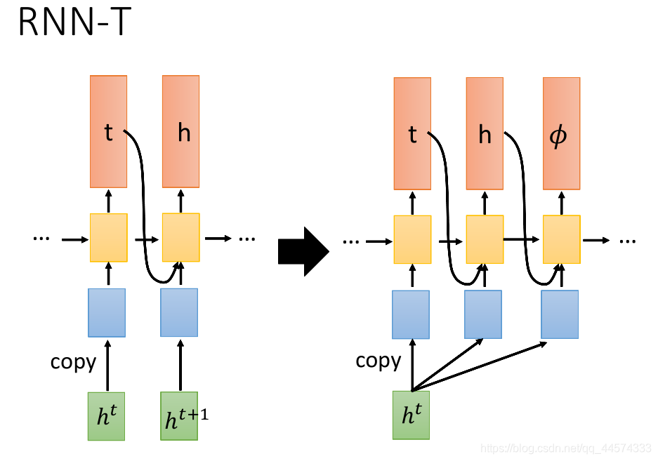 RNN-T看到一个输入以后,一直输出直到输出𝜙为止。如图所示,输入一个ht,RNN-T可以先 生成一个t,再生成一个h,直到𝜙(give me next frame)。