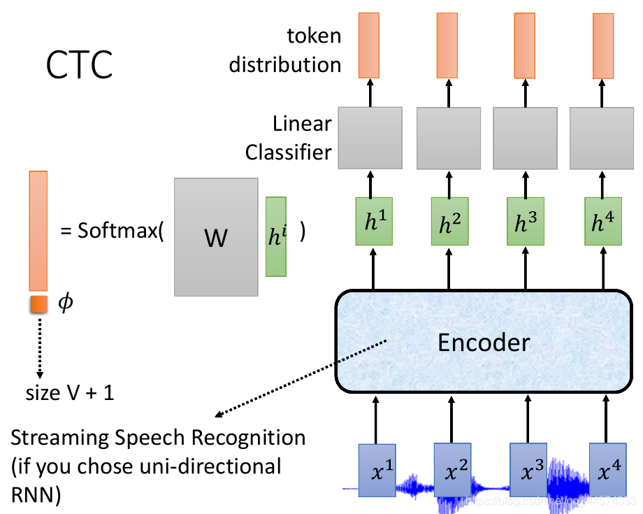 CTC可以说是只有Encoder,在做encoder时要选一些可以做online语音辨识的Encoder,比如说uni-directional RNN 单向RNN,而如果是双向的话要输入整个句子。而单方向的RNN可以输入x1 输出h1等等。在得到h后,将h输入到Linear Classifier,将h乘上一个矩阵再做softmax得到一个所有token的distribution。输入h1产生第一个结果,输入h2产生第二个结果,可以做online的,依此类推。