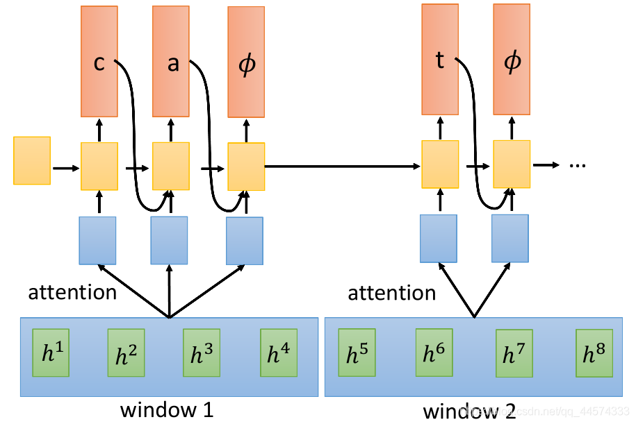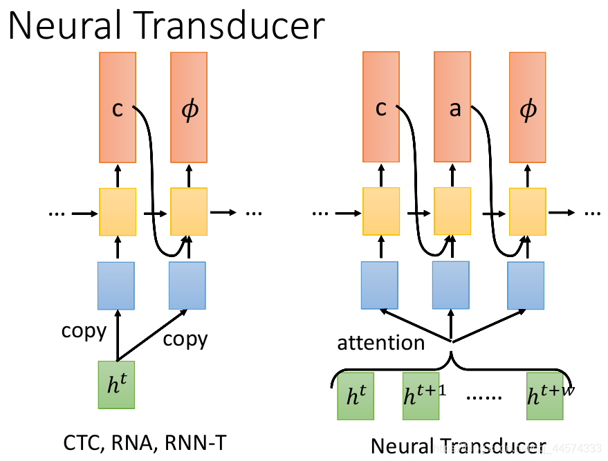 上面讲的CTC、RNA、RNN-T 都是只读一个h进来进行输出,感觉效率不高,而Neural Transducer一次读一段长度为W的h,之后在这个区域内做attention,由attention来决定选择读哪些进入RNN输出。