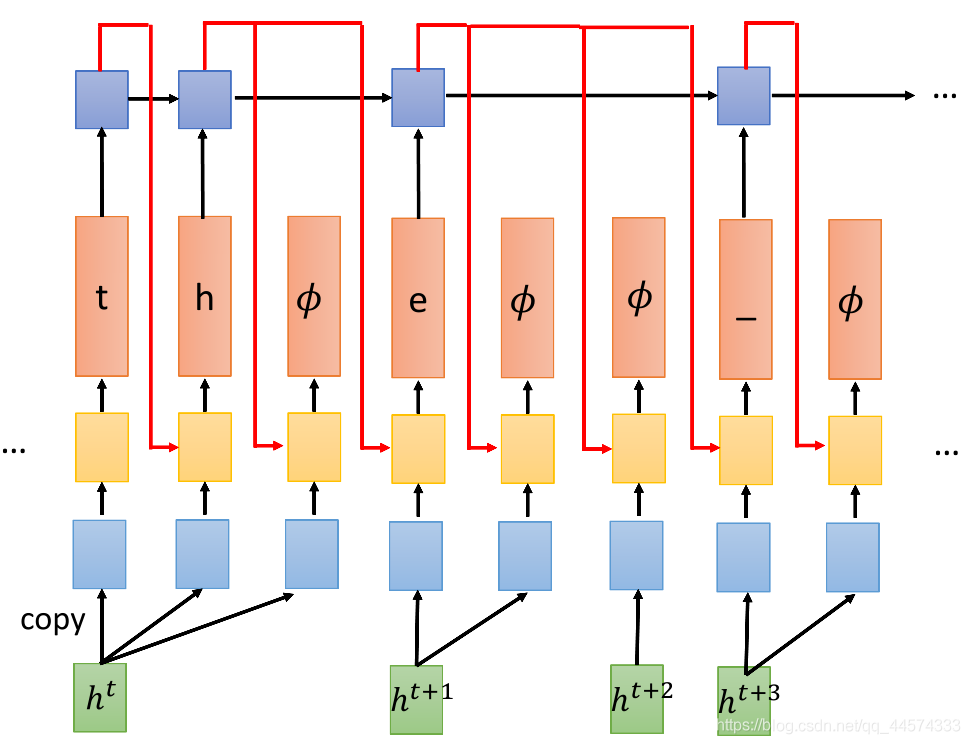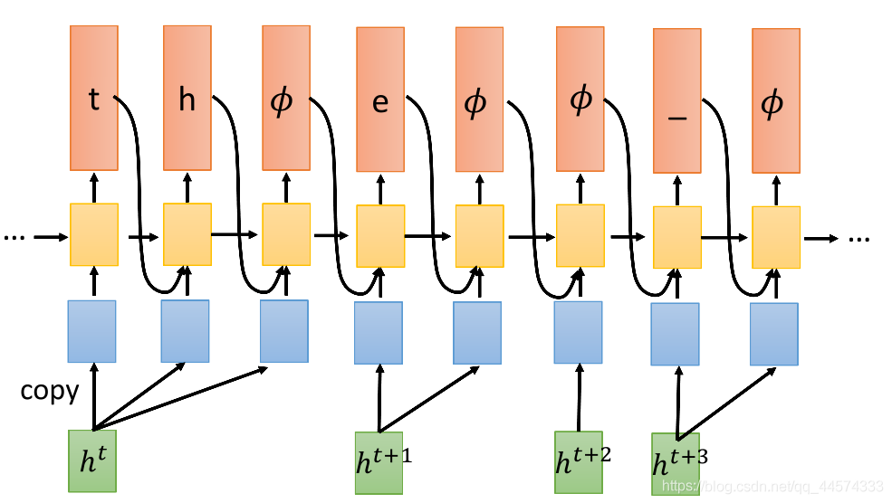 具体而言,我们先有一个来自Encoder的ht,丢给decoder,decoder先输出一个t,然后输出h,之后没有可生成的了,就输出 𝜙。Encoder就会再提供下一个ht+1,同样处理。