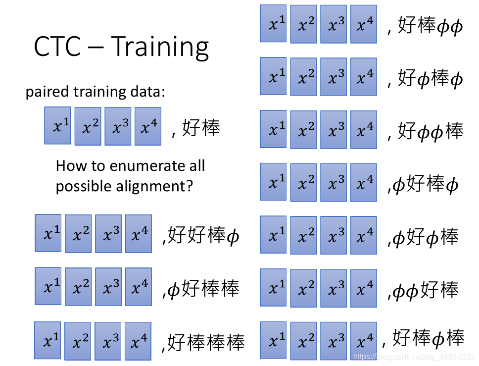 如 好棒 的输入 是 x1 x2 x3 x4的声音讯号,输出可以自己构造为 𝜙 好 𝜙 棒(那其他种,如 好𝜙棒棒等等也是可以的。alignment有很多种方式),那我们该选那一种alignment呢,全都要,穷尽所有的alignment下一节会讲。