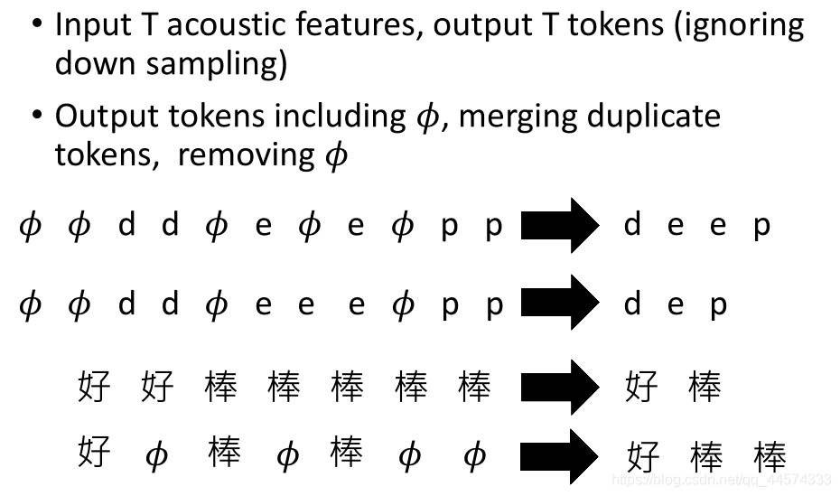 但注意,我们输入的x是acoustic features,它所代表的声音讯号非常小,仅10ms。这一小个feature不一定是一个token,故我们加入一个特别的token,𝜙 (拼音:nuo 四声),代表暂时不知道的。