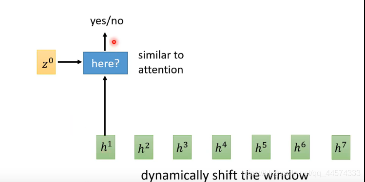 在Neural Transducer 模型中window大小是固定的,而在MoChA里面有一种方式,类似于attention,也是 给它两个vector:z0和h依次输出 yes/no,yes就是把window放在这里。