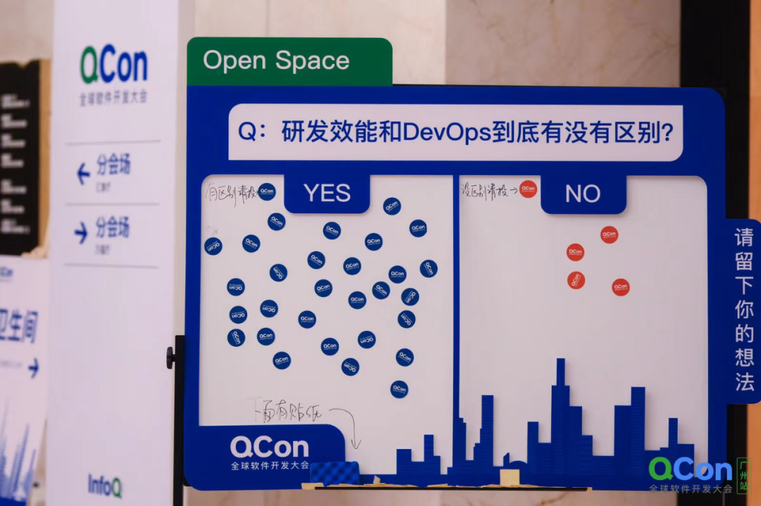 主持人:我们今天找讨论的主题是研发效能度量,对吧。在刚刚的开场自我介绍的环节,很多老师都是一会儿说 DevOps,一会儿说研发效能。因为我本身是做 DevOps 的,我也经常会说 DevOps 研发效能,但是这两个东西到底是不是有区别的,我们今天的讨论就先从这个问题开始。这边有个面板,“DevOps 和研发效能到底有没有区别?”这个问题已经在上面了,白天的时候大会现场已经有一些投票了,那么在座的老师,咱们也花一分钟时间投个票吧,把 Yes 或者 No 的贴纸贴到相应的位置就好,认为有区别选 Yes,没区别就选 No。