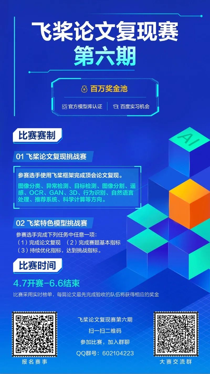 飞桨论文复现挑战赛(第六期)和春天一起来啦!本次挑战赛再度升级,无论是奋战过前五期比赛的复现冠军,还是首次接触论文复现的潜力选手,都有惊喜赛题任务等你来挑战。