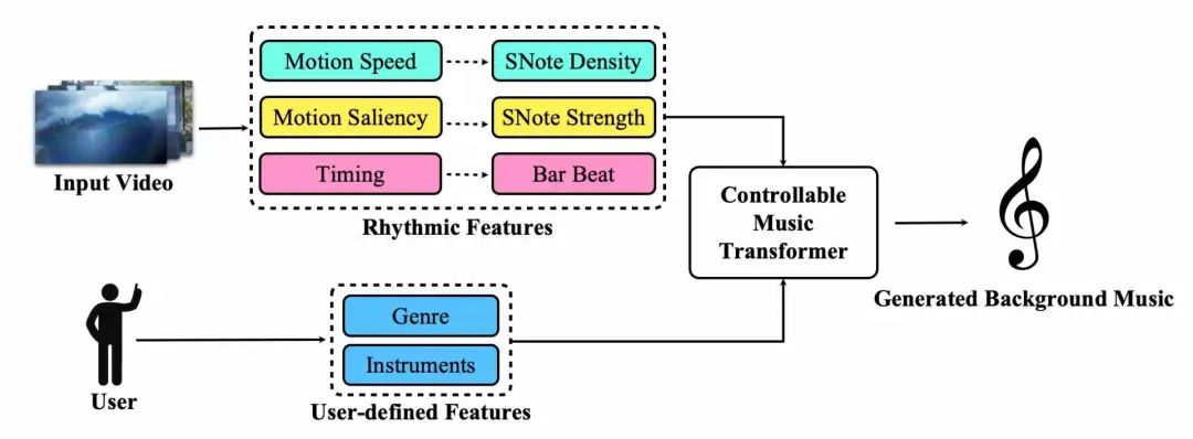 本文提出了 CMT,即一种可控的音乐变换器,它能够对上述节奏特征进行本地化控制,还能对用户指定的音乐流派和使用的乐器进行全局控制。客观和主观评价表明,采用我们的技术,生成的背景音乐与输入的视频的兼容性是令人满意的,同时音乐质量之高也令人印象深刻。