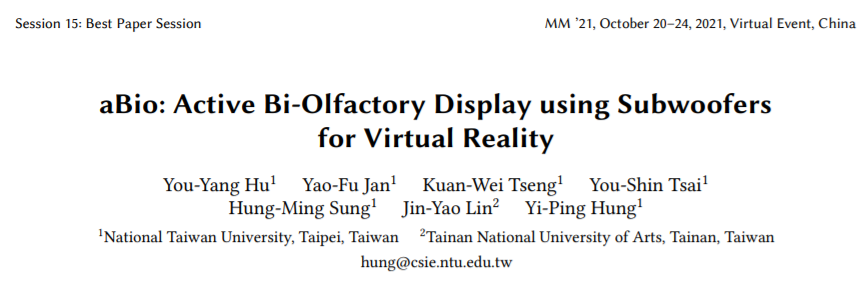 本文提出了一种在虚拟显示环境下的主动式生物嗅觉显示系统「aBio」,可将气味精确地传送到特定位置,增强用户在虚拟环境中的沉浸感。aBio 通过碰撞双扬声器涡流发生器发射的两个涡环,为用户提供自由空气中的自然嗅觉体验,同时可以缓冲空气的冲击力。