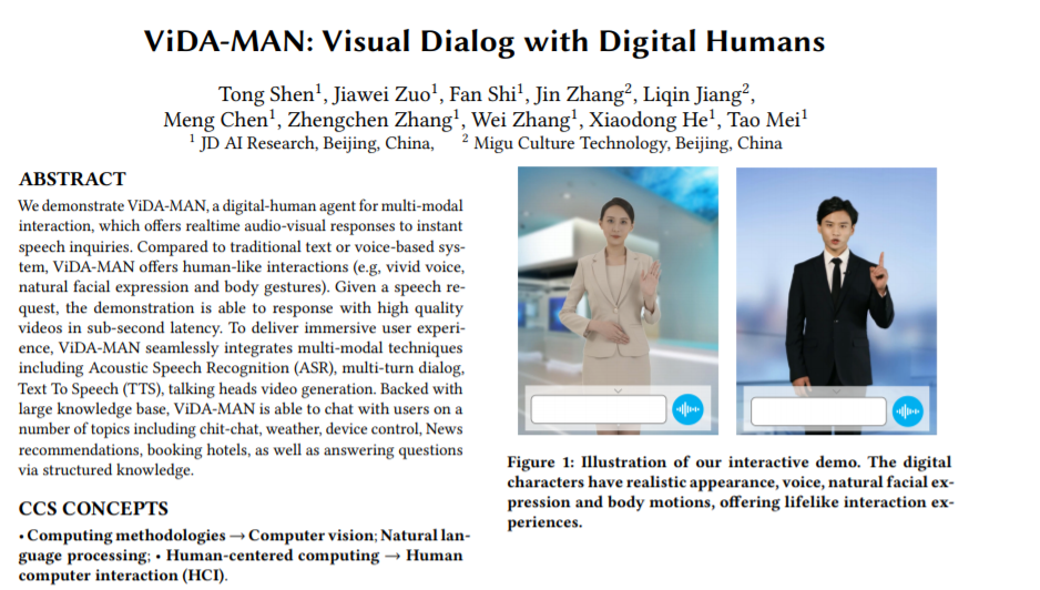 本文提出了一种多模式交互的数字人机代理 ViDA-MAN,为即时语音查询提供实时视听响应。与传统的基于文本或语音的系统相比,ViDA-MAN可以生成生动的语音、自然的面部表情和身体姿势。在给定语音请求的条件下,ViDA-MAN能够以亚秒级延迟响应高质量视频。