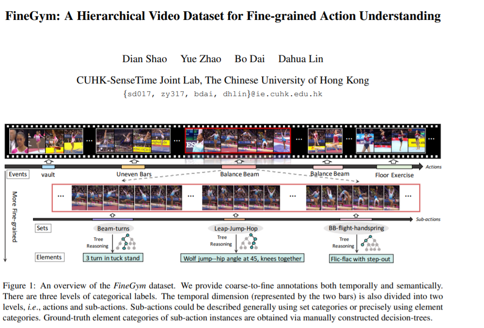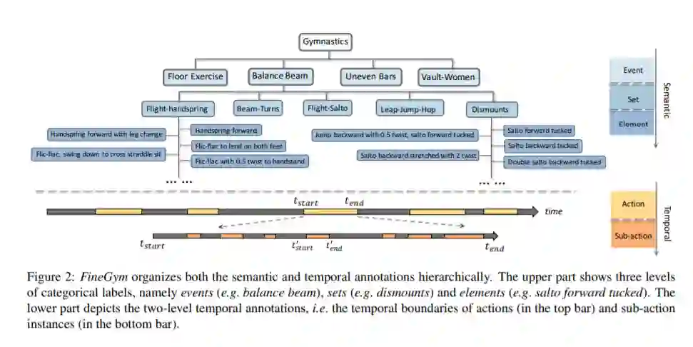 在公共基准数据集上,当前的动作识别技术已经取得了巨大的成功。然而,在现实世界的应用中,例如体育分析,它需要将一项活动分解成几个阶段,并区分细微不同的动作,它们的性能仍然远远不能令人满意。为了将动作识别提升到一个新的水平,我们开发了FineGym,一个建立在体操视频之上的新数据集。与现有的动作识别数据集相比,FineGym具有丰富、优质和多样性的特点。特别是,它提供了一个三层语义层次的动作和子动作级别的临时注释。例如,一个“平衡木”事件将被注释为来自5个集合的基本子动作序列:“leap-jump-hop”、“beam-turns”、“flight-salto”、“flight-handspring”和“dismount”,其中每个集合中的子动作将被进一步注释为定义良好的类标签。这种新的粒度级别对操作识别提出了重大挑战,例如如何从一个一致的操作解析时间结构,以及如何区分细微不同的操作类。我们系统地研究了该数据集上的代表性方法,并获得了一些有趣的发现。我们希望这个数据集可以促进动作理解的研究。