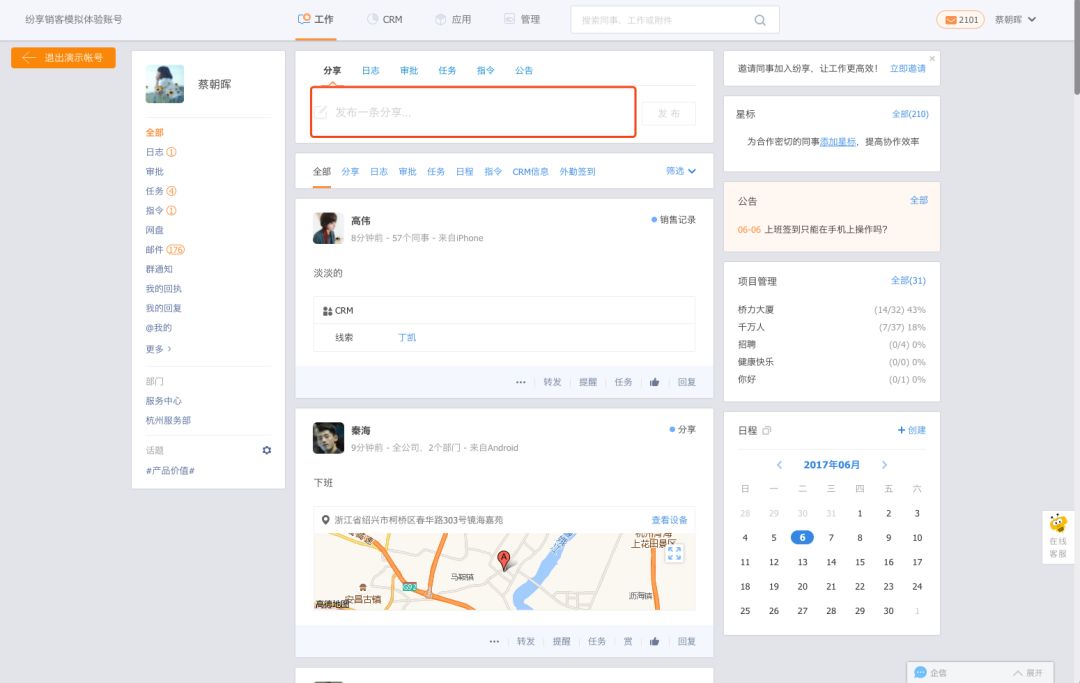 它还有很好的权限管理,比如说部分内容对部分员工可见。