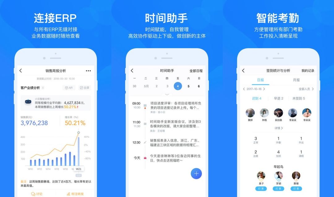 你可以把它当做时间助手,还有连接ERP 的报表。同时文件管理,审批,签到等功能。
