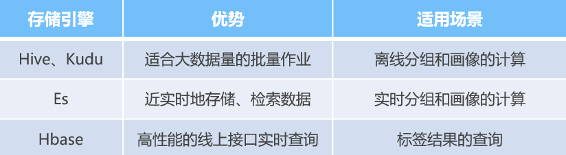 多种数据源的导入和管理:支持hive、kudu、es、hbase四种数据存储引擎,不同的标签数据存储引擎主要是为了满足不同的场景