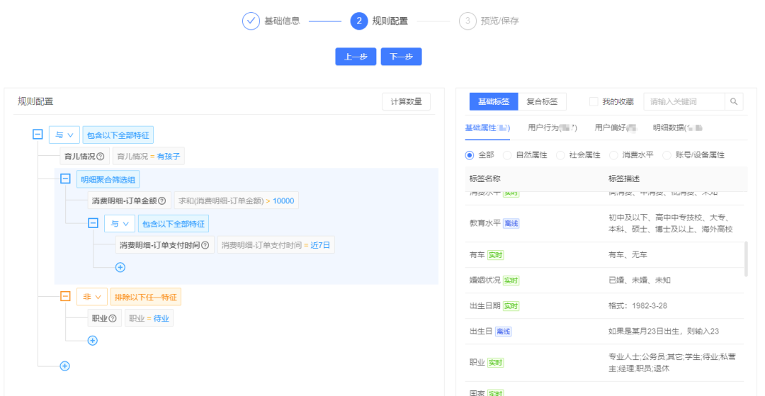可视化建模:通过可视化界面自由组合海量标签创建新的标签,实现0成本标签自助生产,快速满足业务需求。例如,我们要构建一个【有孩子、近7天有高消费且未待业的家长】,可以按照下图的规则建模: