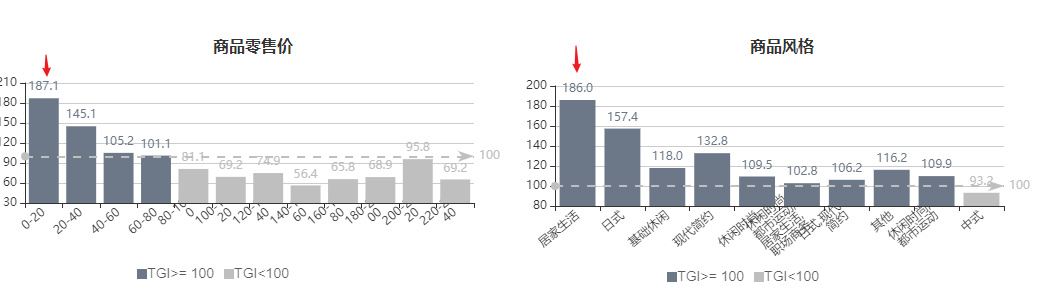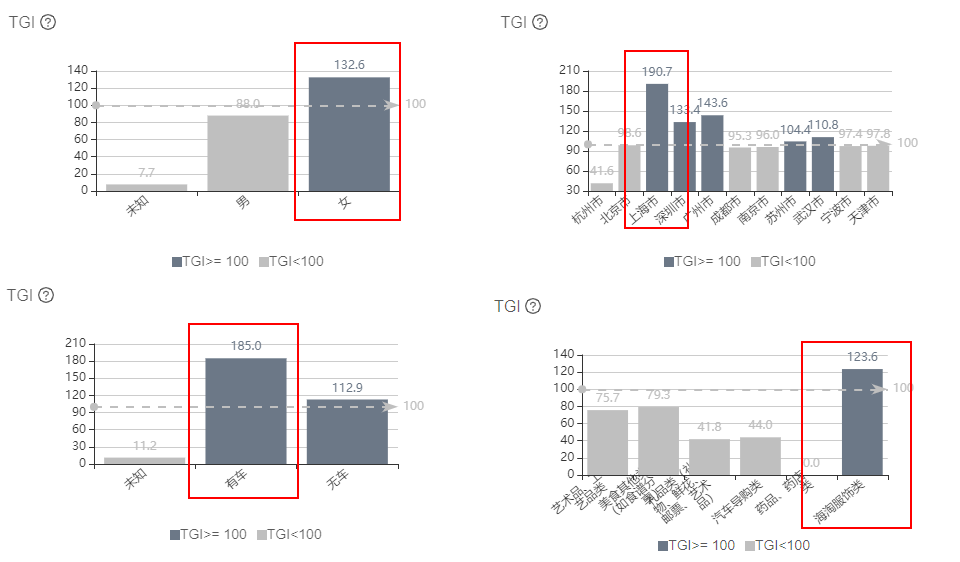 TGI作为度量差异性的重要指标可以让我们更直观地看到目标组的显著特征(TGI=[目标分组中具有某一特征的实体所占比例/对照组中具有相同特征的实体所占比例]*标准数100)