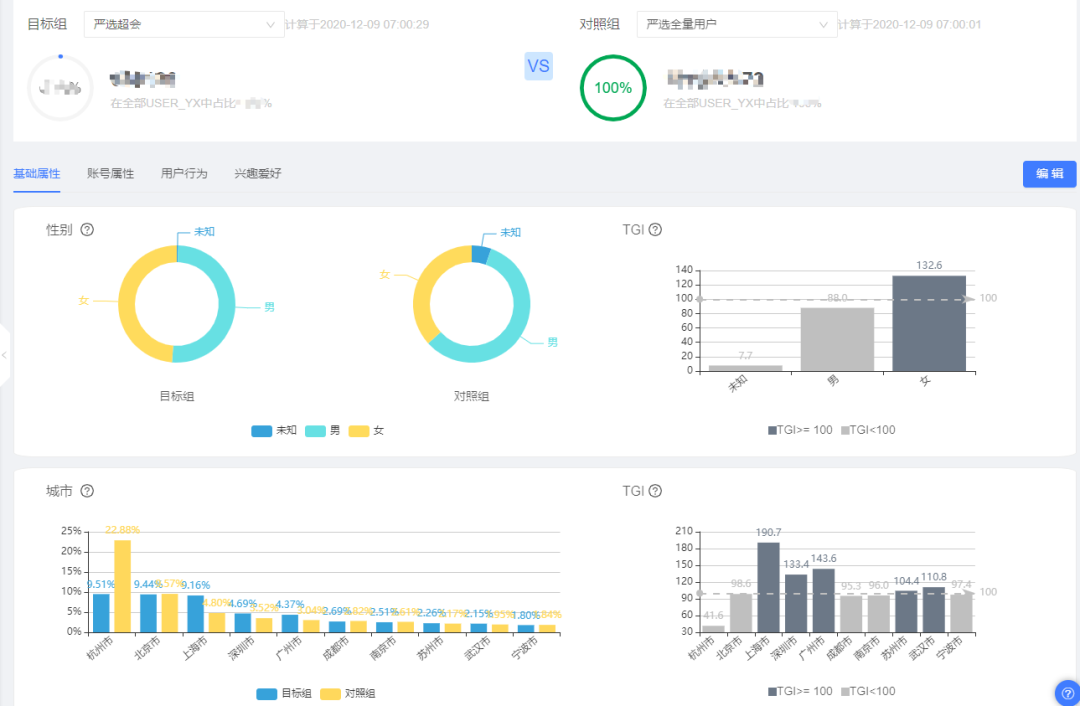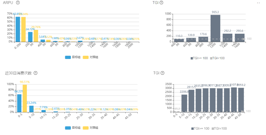 分组对比是画像常用的一种分析方法。在选取目标组和对照组后,通过对比我们可以看到两个分组的差异性。