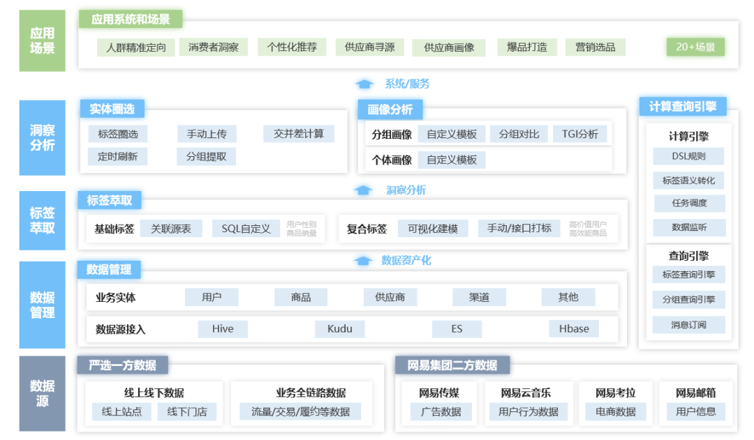 严选标签和画像中台定位为提供从数据管理、标签萃取、洞察分析的全流程数据驱动能力,下图为严选标签和画像中台的产品大图:
