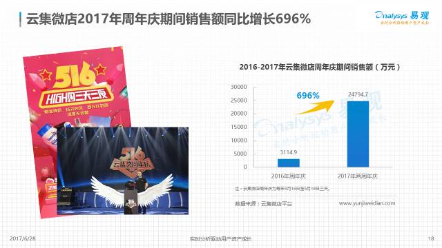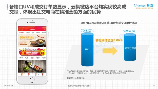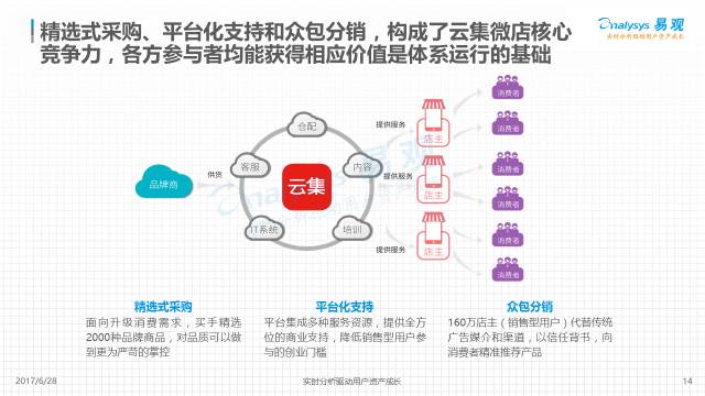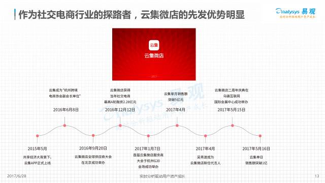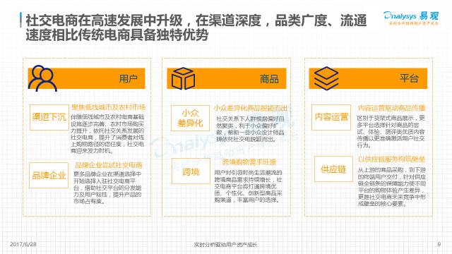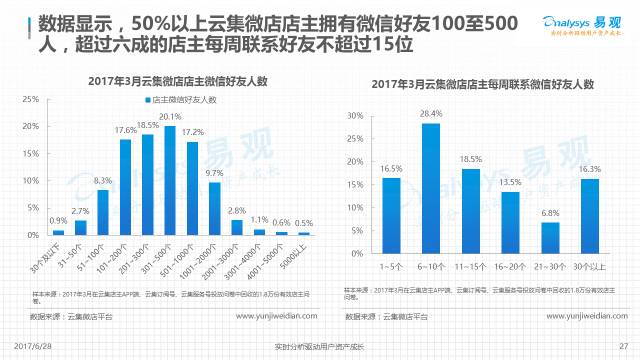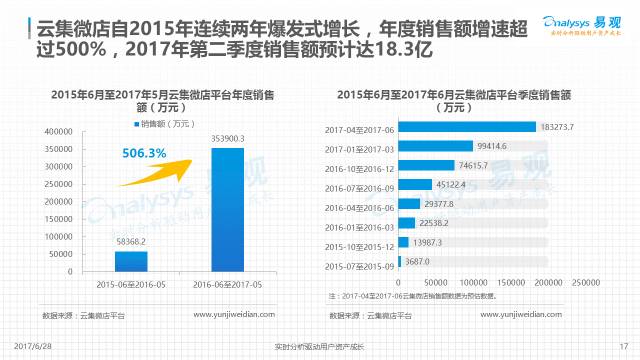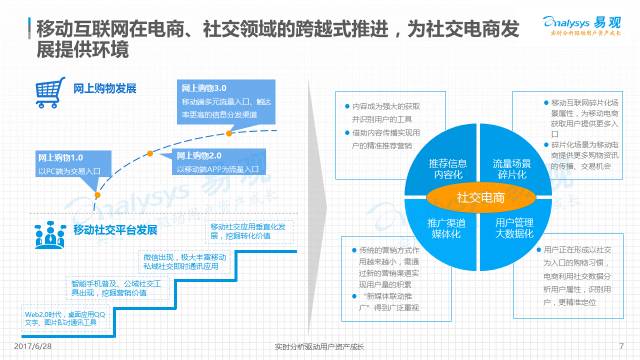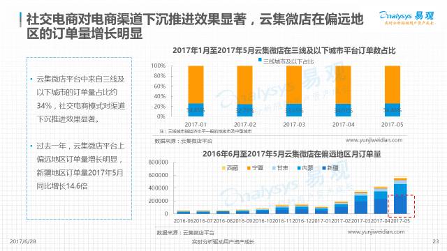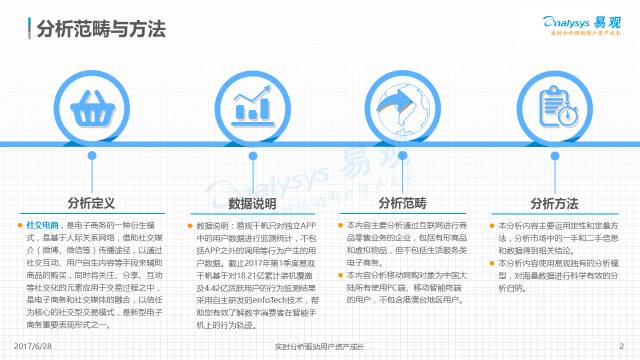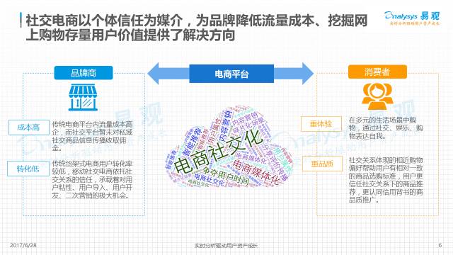 2016年是社交电子商务的爆发元年,网上零售在初显增速放缓中探寻到一条将电子商务与社交媒体相融合的创新模式,极大激活了市场活力。 云集微店和易观联合发布了《2017中国社交电商大数据白皮书》,从社会、经济、商业等层面分析了社交电子商务的发展背景、市场成因,以及作为创新模式在未来的发展趋势。通过聚焦到社交电商典型厂商云集微店进行数据分析,同时挖掘了当前社交电商发展的一些特征。