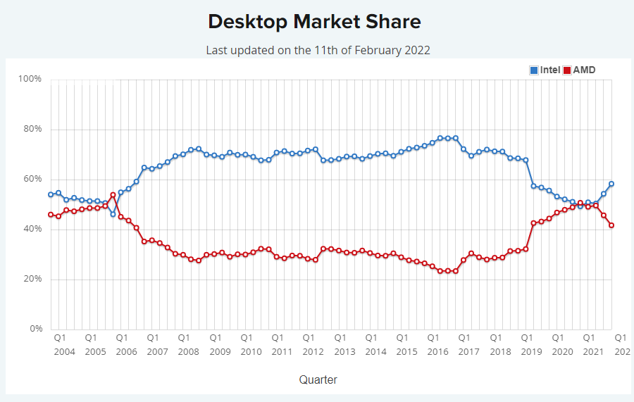 对于台式电脑,2019年AMD有32%的市场份额,截至2021年,英特尔和AMD的市场份额是50/50。