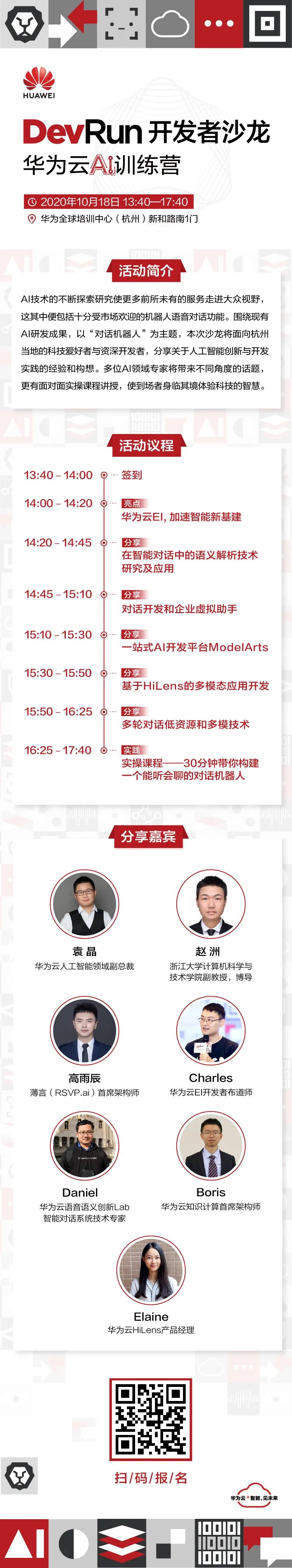 10 月 18 日下午,「华为云 AI 训练营·对话机器人」主题沙龙杭州专场将在华为全球培训中心(杭州)新和路南1门举行。在本次沙龙中,将有多位技术专家将以对话机器人为主题分享他们的开发经验和技术解读。
