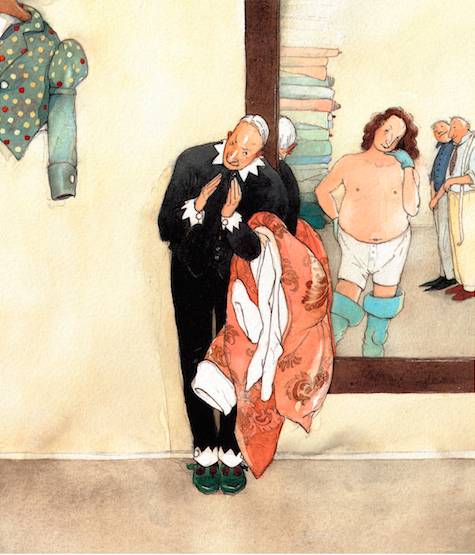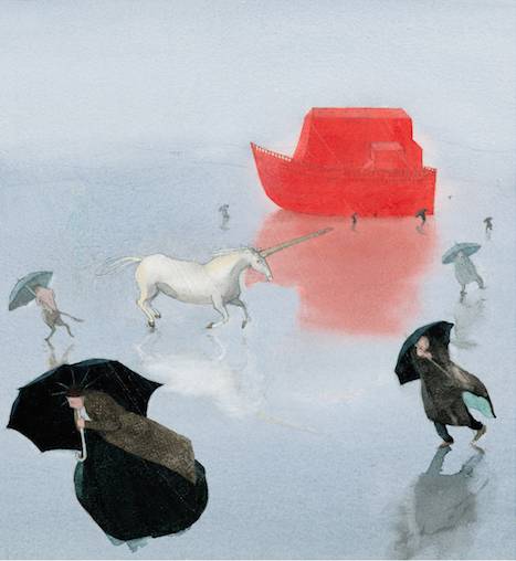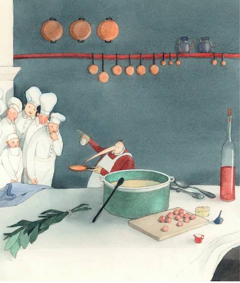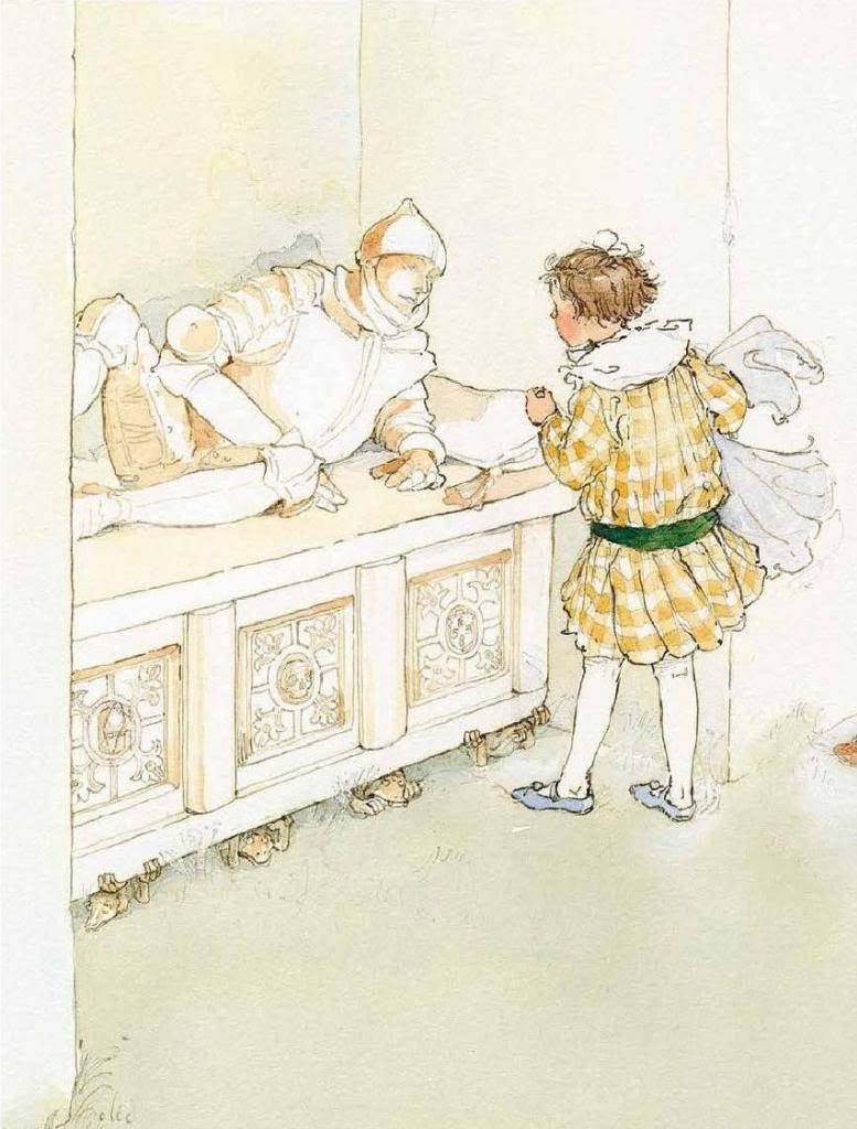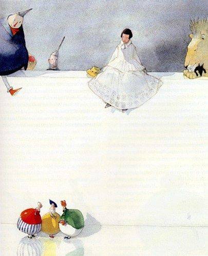 “是的,我对经典的故事和童话情有独钟。它们已经被画过无数次了,重复任何一次都毫无意义,但惊喜总是好的。一个听过无数的,古老的故事,却能让你感到惊奇,怎么做到的呢?秘诀就是假装你是第一次听到这个故事,假装这是一个全新的故事,忽略所有你在那个故事里的期待,避免一切与这个故事有关的陈词滥调。这并不容易,你得非常专注,尤其是当你已经看了很多过去的插画以后。”