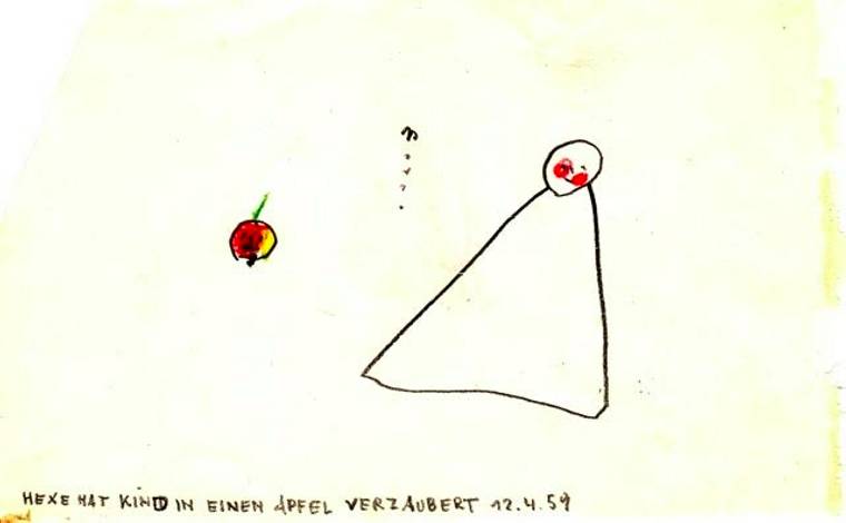 茨威格自小喜爱绘画,这是她5岁时画的一幅涂鸦——“巫婆把孩子变成了一个苹果”,她对童话与魔法的迷恋从这里就已经开始了。