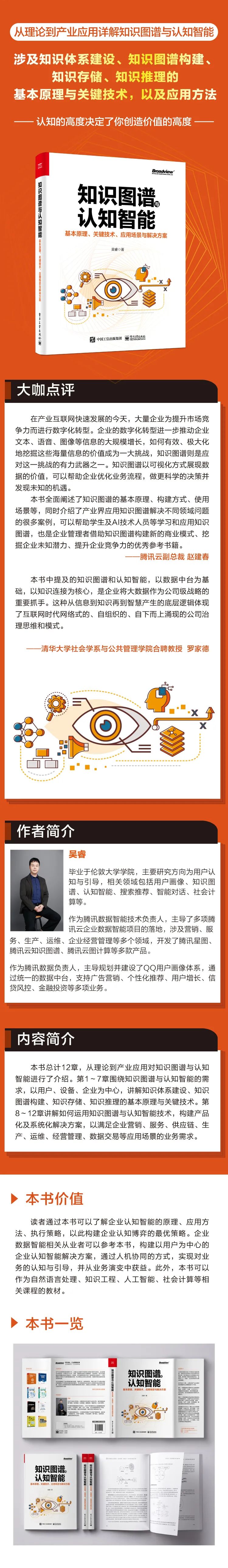 《知识图谱与认知智能:基本原理、关键技术、应用场景与解决方案》一书从战略、架构、应用体系、团队建设、产出分析等角度介绍了企业认知大脑的整体解决方案;并围绕企业认知与决策的核心痛点,分享了企业知识库、企业决策助手等解决方案;以及就企业办公智能及企业风控与投资场景,分享了认知智能解决方案。