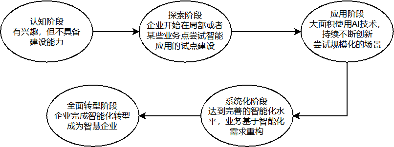 企业的认知智能转型将会面临诸多挑战,需要经历不同的阶段才能实现认知智能落地。图2展示了企业认知智能转型的过程,在整体上包括认知、探索、应用、系统化及全面转型阶段。