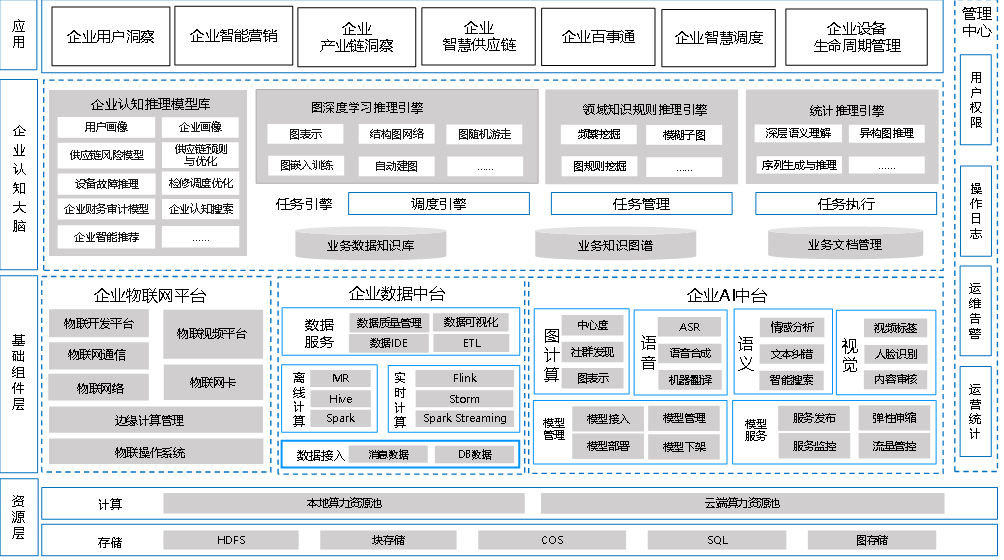 企业认知大脑帮助企业实现认知与决策的数字化及智能化,进而实现企业的生态协同。企业认知大脑是面向企业数据智能需求的综合解决方案,整体框架如图4所示,它如同设备认知大脑,是建设在由企业物联网平台、企业数据中台及企业AI中台构成的基础组件层之上的。
