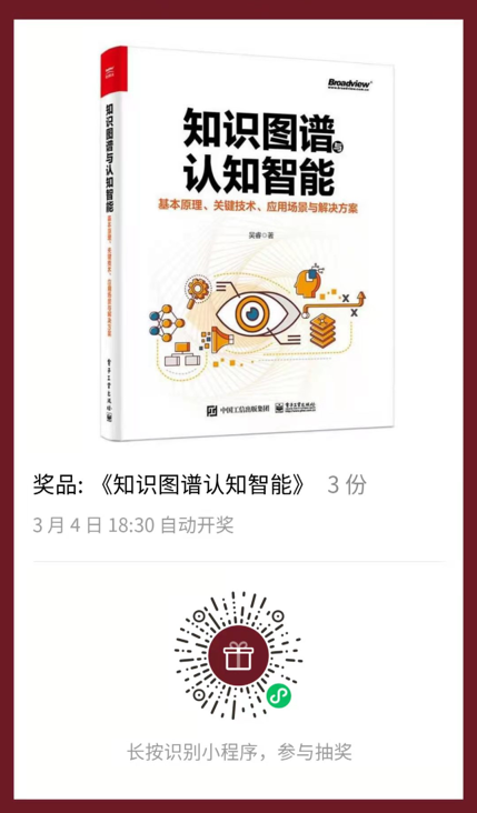 AI 前线为粉丝准备了《知识图谱认知智能》纸质书籍 3 本!长按识别下图小程序,参与抽奖活动,由小程序随机抽出 3 位,每人赠送一本书。开奖时间:3 月 4 日(下周五) 18:30,获奖者每人获得一本。