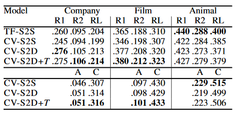实验中将模型与谷歌2018年的工作进行了对比。结果如下表(TF-S2S为谷歌模型,A代表生成结果与标准结果的重合度,C代表生成结果与输入语料的重合度):