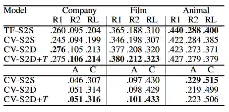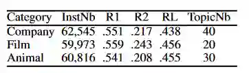 该文在自己构造的数据集WIKICATSUM上进行了实验,其中包含三类文档:公司,电影与动物。具体参数如下(R1,R2.RL分别代表ROUGE-1, ROUGE-2,ROUGE-L的召回率):